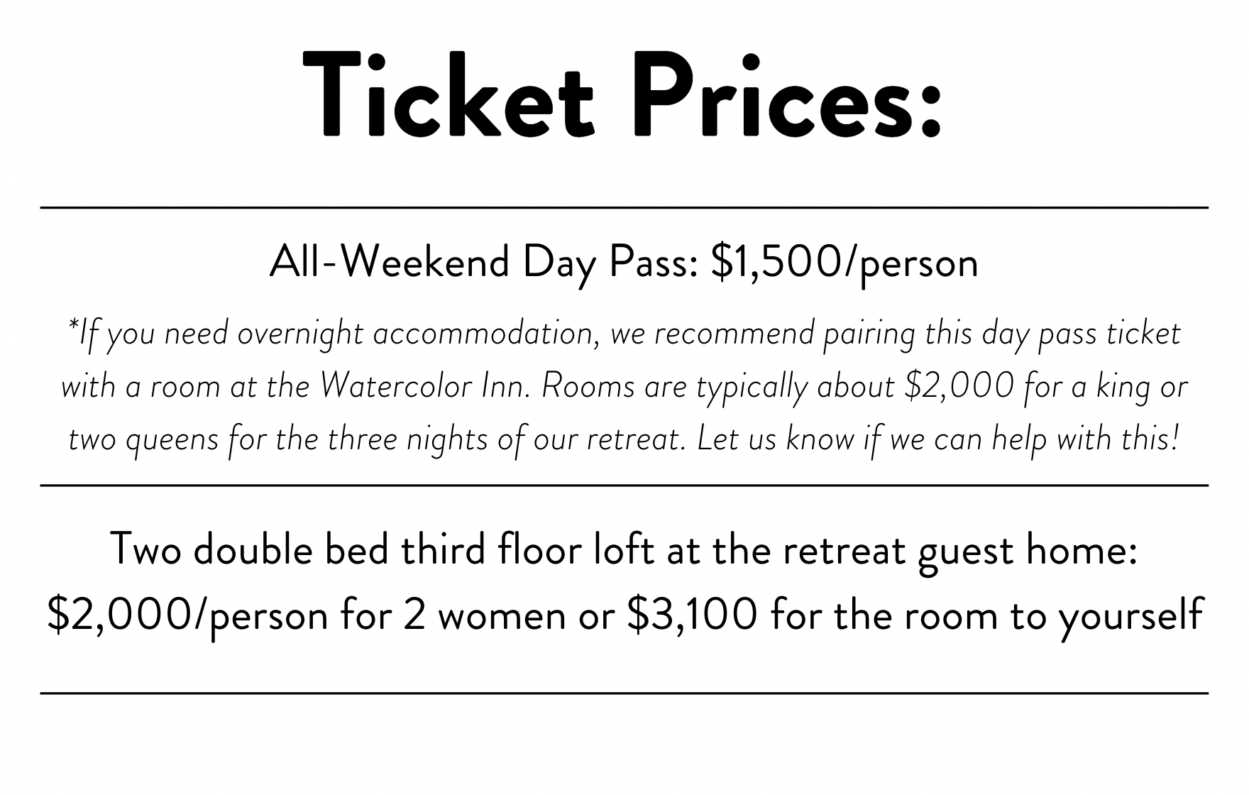 *If you need overnight accommodation, we recommend pairing this day pass ticket with a room at the Watercolor Inn. Rooms are typically about $2,000 for a king or two queens for the three nights of our retreat. Let us know if we can help with this!